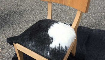 Chaise de salle à manger recouverte de peau de vache, dossier et piètement vernis mat incolore